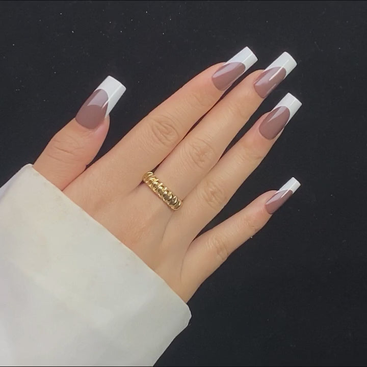 Rich mocha tones meet crisp white tips in this sleek take on the French manicure. The bold contrast is elevated by our coffin shape, creating a sharp silhouette that feels modern, confident, and fashion-forward.